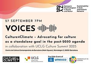 The evening talk by 2N2K Deutschland in collaboration with the UCLG Culture Summit 2025 is tackling a main topic of MONDIACULT 2025 and builds on long-term experiences from 2N2K´s nationwide Culture4Climate programme. Advancing climate protection and sustainability in the German cultural sector. Culture4Climate brings together cultural institutions, practitioners, networks, associations, administrations and environmental organizations. The programme promotes collaborative action on climate and sustainability goals, offering creative labs, practical tools, and strategic partnerships for measurable emission reductions and cultural transformation. Referring to the programme´s policy paper Culture as element of transformative environmental policy and its Sustainability Declaration for the Cultural Sector the dialogue series collects voices and positions from different perspectives to the central conference issue: How will culture as a standalone goal in the post-2030 agenda enhance sustainable development in the regions and integrate diverse societal and political ambitions.